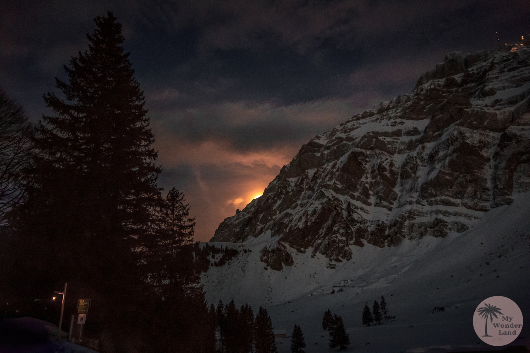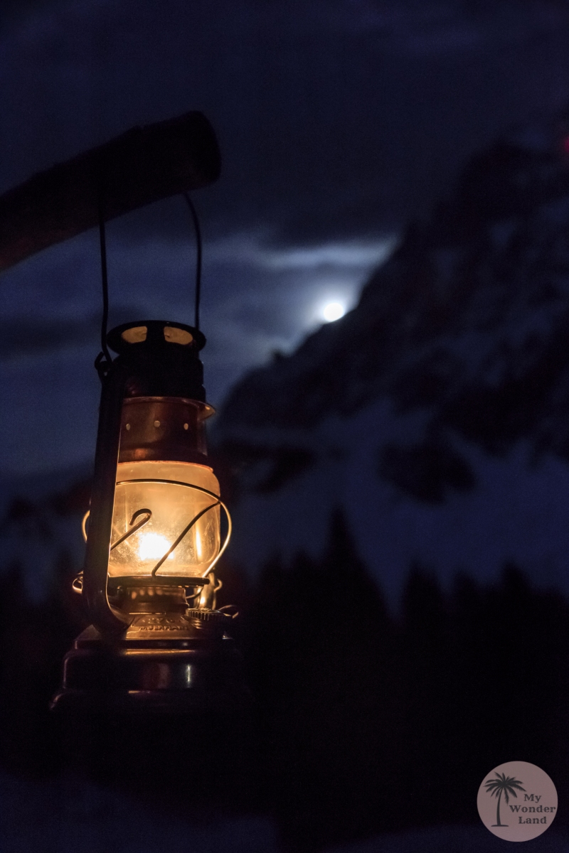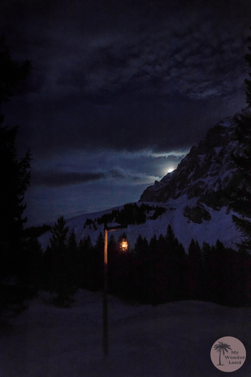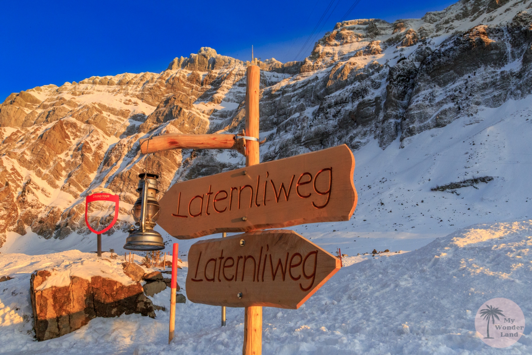 Actually, we wanted to go sledding somewhere, but since the sledding runs were closed in many places because of too little snow, we spontaneously decided to go on a day trip to the Säntis. When I was looking for a short hike on Schweiz Mobil, I discovered the latern path and was immediately enthusiastic about the idea. I imagined something very special, especially since there was by coincidence a full moon at that time. Perfect timing I would say. 🙂