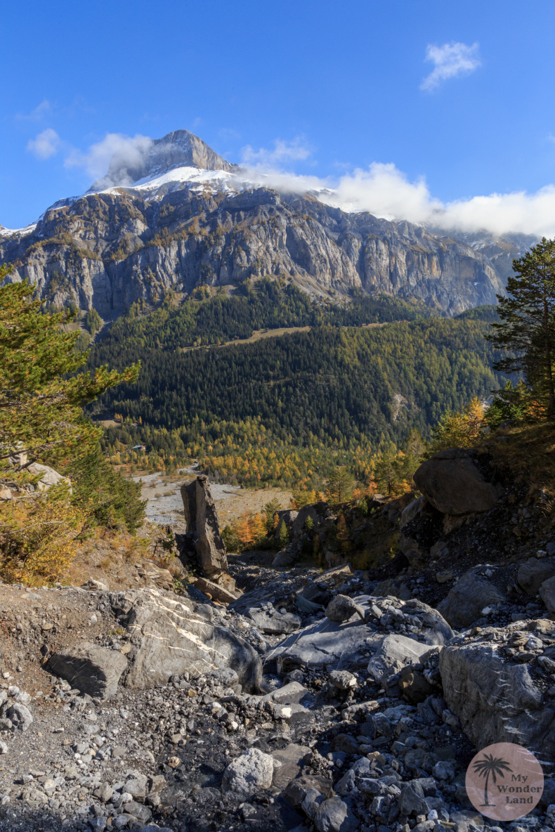 1714 erlebte das Derborence Tal seinen ersten Bergsturz. 35 Jahre später folgte der zweite, weitaus schlimmere. Der Bergbach wurde durch die herab gestürzten Gesteinsbrocken gestaut. So entstand der See Lac de Derborence. An diversen Stellen kann man direkt neben dem Wanderweg einige dieser Felsbrocken bestaunen.